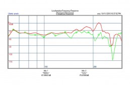Spodnji graf prikazuje prenos energije na betonska tla v odvisnosti od frekvence. Meritev smo izvajali na istem zvočniku, pri tem smo uporabili konice (graf rdeče barve) in SwingBase (zelen graf). Iz grafa je razvidno, da SwingBase zmanjša prenos energine na tla tudi do 20dB (!)